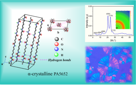 貴大新聞網(wǎng)訊(材料與冶金學(xué)院)近日,我校材料與冶金學(xué)院劉玉飛特聘教授團(tuán)隊(duì)在生物基聚酰胺材料研究領(lǐng)域取得重要突破,相關(guān)成果以 Biobased Polyamide 5652 with α?Crystal Form: Characterization and Low Moisture Absorption為題,發(fā)表于高分子領(lǐng)域頂級(jí)期刊Macromolecules(自然指數(shù)期刊,中科院一區(qū)TOP)。貴州大學(xué)材料與冶金學(xué)院為論文第一完成單位,材料與冶金學(xué)院2022級(jí)碩士研究生王艷平為第一作者,劉玉飛特聘教授為通訊作者。近年來,生物基聚酰胺56(PA56)因其原料可再生、低碳環(huán)保而備受關(guān)注,但其特殊的分子結(jié)構(gòu)(戊二胺單元含奇數(shù)碳原子)導(dǎo)致其晶體通常以γ晶型為主,飽和吸水率高達(dá)12%以上,在潮濕環(huán)境中力學(xué)性能顯著下降(如拉伸強(qiáng)度降低20%-30%),嚴(yán)重限制了在精密工程領(lǐng)域的應(yīng)用,而傳統(tǒng)改性方法往往以犧牲材料其他性能為代價(jià)。針對(duì)這一難題,劉玉飛特聘教授創(chuàng)新性地提出了雙氫鍵結(jié)構(gòu)調(diào)控策略:自主合成關(guān)鍵單體,設(shè)計(jì)并成功合成新型565二胺單體(C16H34N4O2),將565二胺與草酸二丁酯通過溶液聚合及